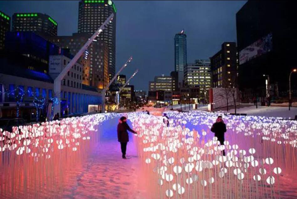 該項(xiàng)目的設(shè)計(jì)是從魁北克的麥田里得到靈感的,當(dāng)小麥迎著微風(fēng)左右擺動時(shí),景色尤其美麗。由麥田浮動而生的Entre les rangs裝置是由成千個(gè)靈活柔韌的莖管組成,管狀結(jié)構(gòu)頂部附有一個(gè)白色的反光膜,這些反光膜利用周圍的景觀刺激可以不斷移動變換,充滿活力與動感。